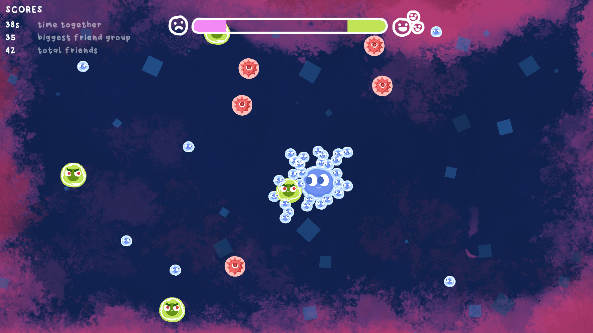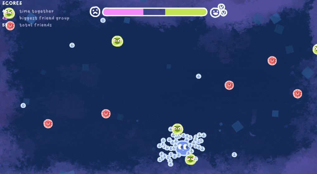 Beat your high score by keeping your friend group together for as long as possible by dodging haters and toxic friends!